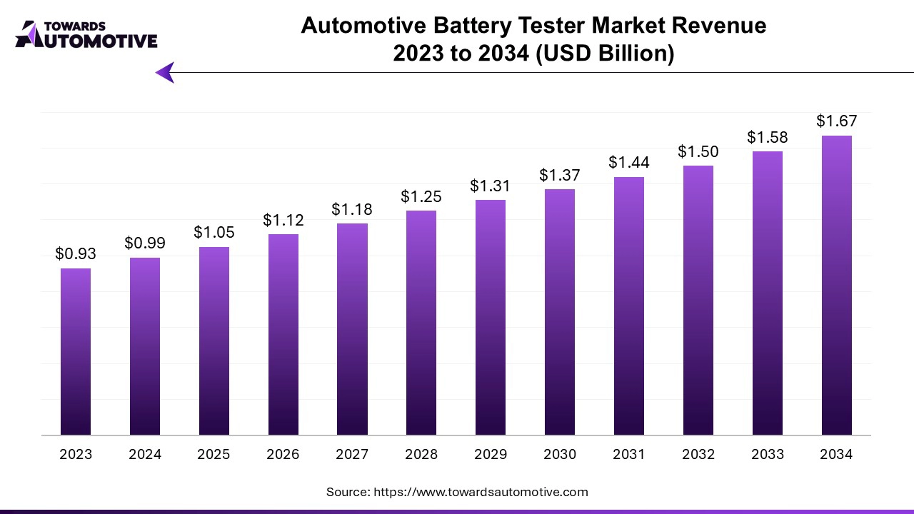 Ottawa, Oct. 07, 2025 (GLOBE NEWSWIRE) -- The global automotive battery tester market reached approximately USD 1.05 billion in 2025, with projections suggesting it will climb to USD 1.67 billion in 2034, according to a report from Towards Automotive, a sister firm of Precedence Research.